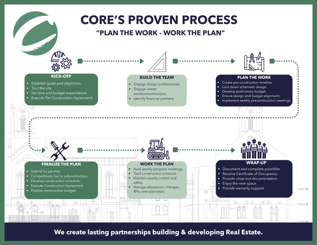 CORE Resources is a premium builder and developer of retail, office, restaurant, residential and healthcare facilities. We are a company of values where people are our assets. At CORE, we think like owners, anticipate challenges and adapt accordingly. Our clients experience our passion through the detailed process we execute on every project. We are different: our background in development allows us to see the entire picture and bring creative and innovative solutions to the table.